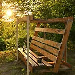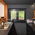 تم تجهيز بيت العطلات بالمجمدة والموقد المسطح وأدوات المطبخ للخدمة الذاتية في منطقة لتناول الطعام في الهواء الطلق.